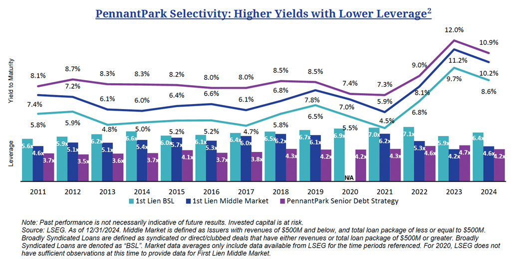 The information herein reflects PennantPark’s investment approach at the time of publication but does not guarantee specific outcomes. Leverage levels, underwriting processes, and risk assessments are subject to change and may vary across investments. Leverage may magnify both gains and losses, and past strategies are not indicative of future performance or risk mitigation. Investing involves risk, including market fluctuations, liquidity constraints, regulatory considerations, and the potential loss of principal. Investors should carefully assess all associated risks before making investment decisions.